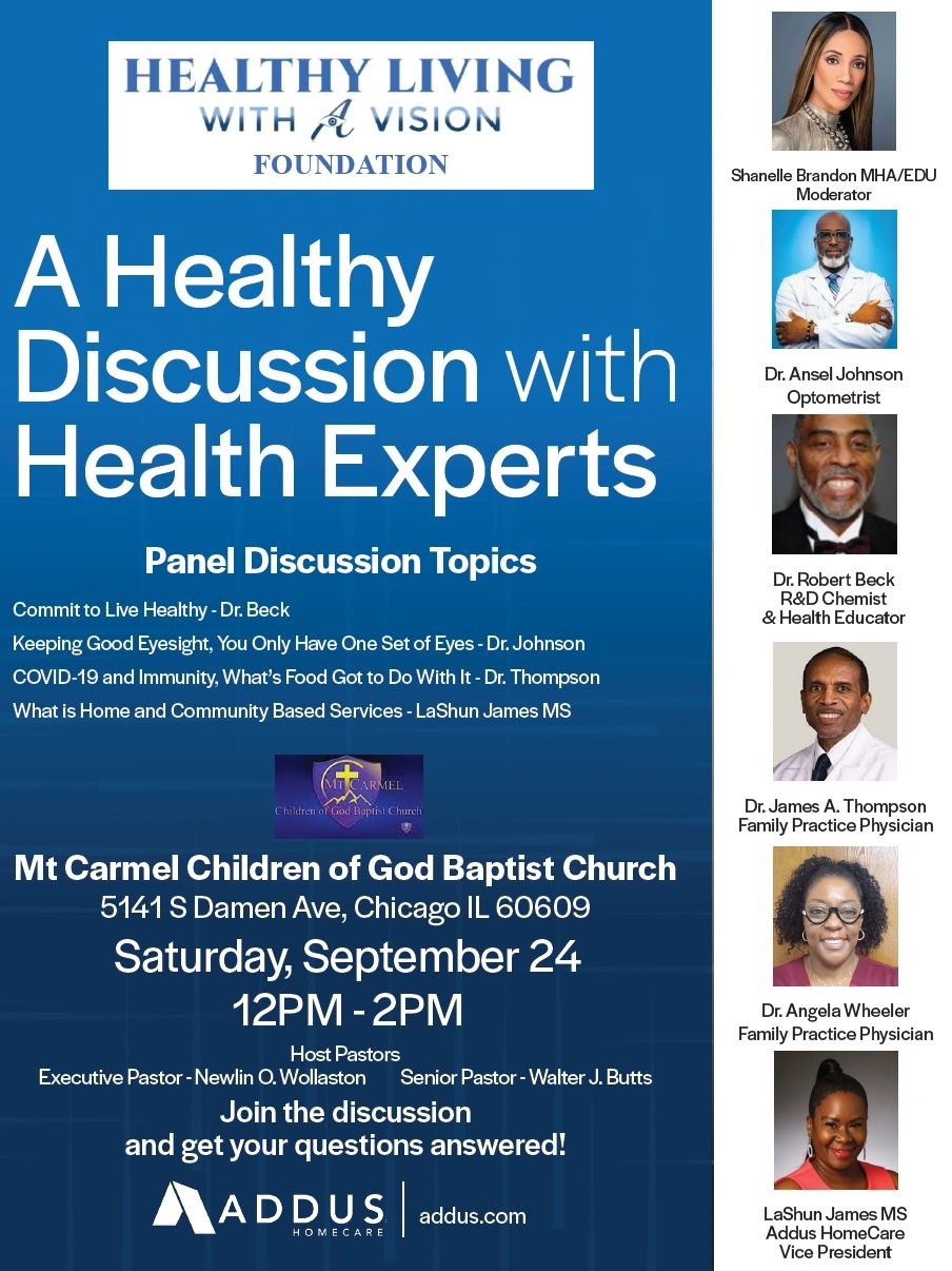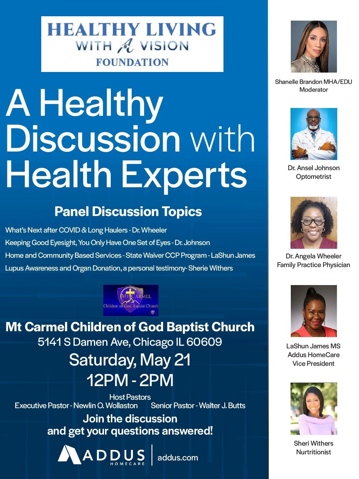 Healthy Living With A Vision and Addus Healthcare partner for our next in-person event. Learn about COVID-19 updates, eyesight tips, lupus awareness, and other services. Get your questions answered from experts in the different fields. Join us at Mount Carmel Children of God Baptist Church on Saturday, May 21, 2022 at
