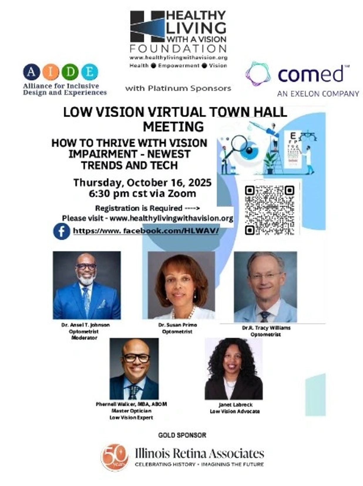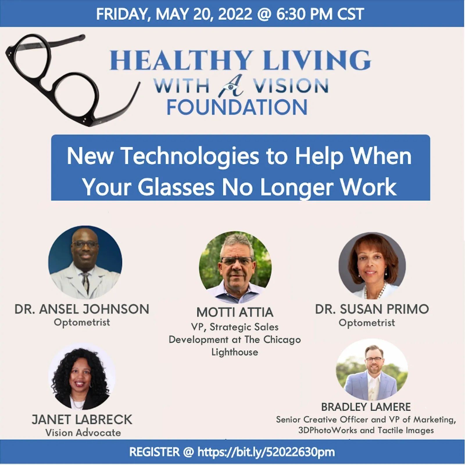 Join Healthy Living With A Vision at our next virtual town hall on Friday, May 20, 2022 at 6:30 p.m. CST. Learn about the new technologies that can help relieve you of your eye care troubles. Click the link below to register for the Zoom invite.